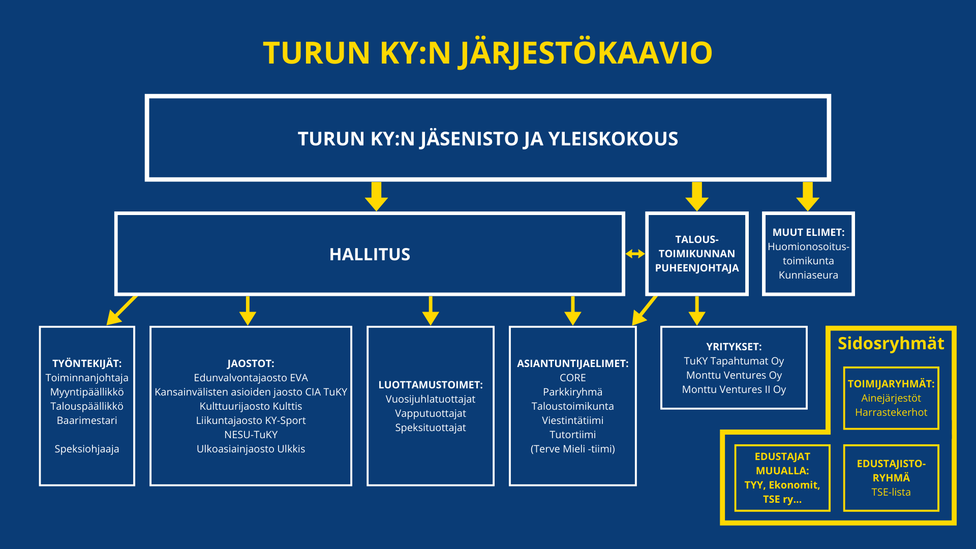 Jaostot ovat osa Turun KY:tä ja jaostojen puheenjohtajat ovat TuKYn hallituksen jäseniä. Asiantuntijaelimiä johtavat hallituksen jäsenet sekä työntekijät. Toimijaryhmät ovat erilaisia aine- ja harrastejärjestöjä, jotka ovat itsenäisiä rekisteröityjä yhdistyksiä ja päättäneet liittyä TuKYn toimijaryhmärekisteriin. Projektien tuottajat ja tiimit valitaan avoimella haulla vuosittain. TuKYn toimintaa ylläpitää aktiivisesti yli 200 TuKYläistä joka vuosi.